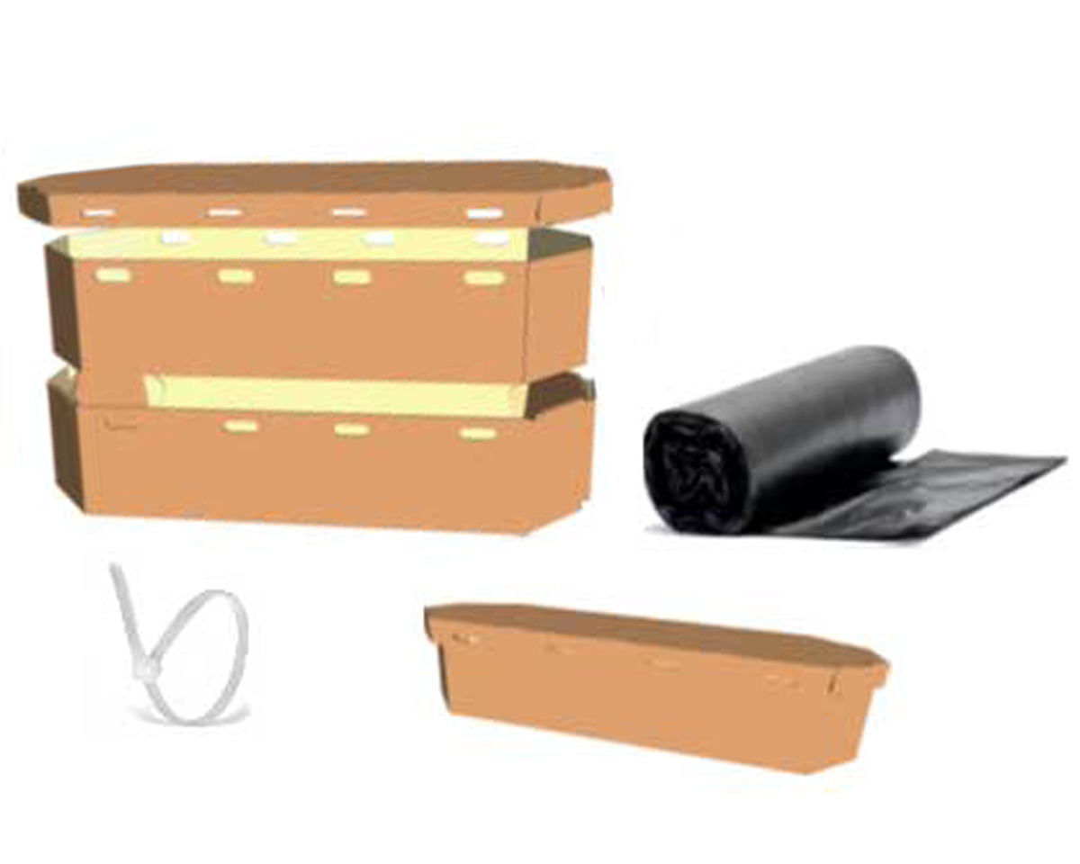 Ataúd, bolsa y dos cinchos para cierre de la bolsa. Capacidad: 100 kilos.
